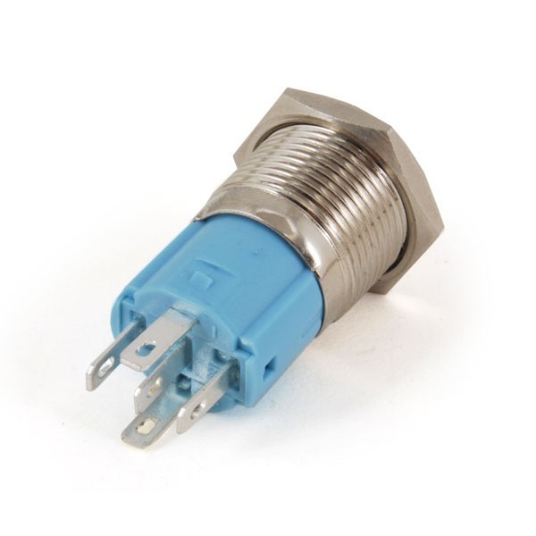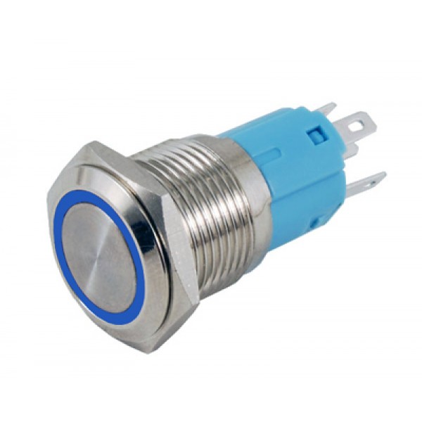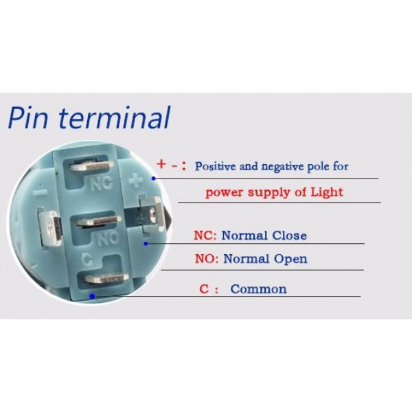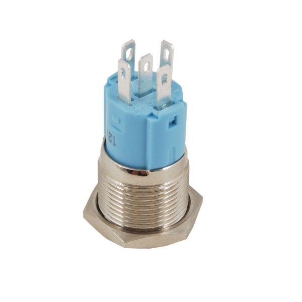 Pulsante antivandalo in metallo con contatti NC/NO/C (normalmente aperto / chiuso e comune) e illuminazione a LED (contatti + e -). Colore illuminazione: blu, alimentazione LED: 12 VDC, durata LED: > 40.000 ore, massima tensione contatti: 36 VDC / 2 A, temperatura di funzionamento: da -20°C ~ +55°C, umidità: 45 ~ 85% RH, resistenza di isolamento: > 1000 Mohm, resistenza di contatto: < 50 Mohm, vita meccanica: 100.000 cicli (ON/OFF), vita elettrica: 20.000 cicli, corpo materiale: ottone nichelato, foro di fissaggio: Ø 16 mm, grado di protezione: IP65 / IK8 (livello di resistenza agli urti meccanici). |