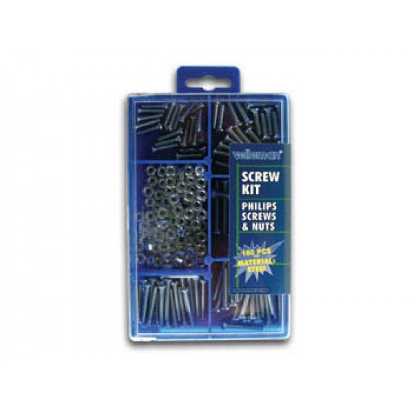 Confezione di 180 pezzi di viti e dadi da 2.5 e 3 MA. Materiale: acciaio zincato.